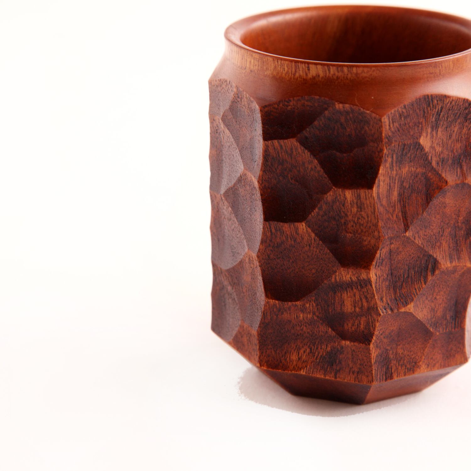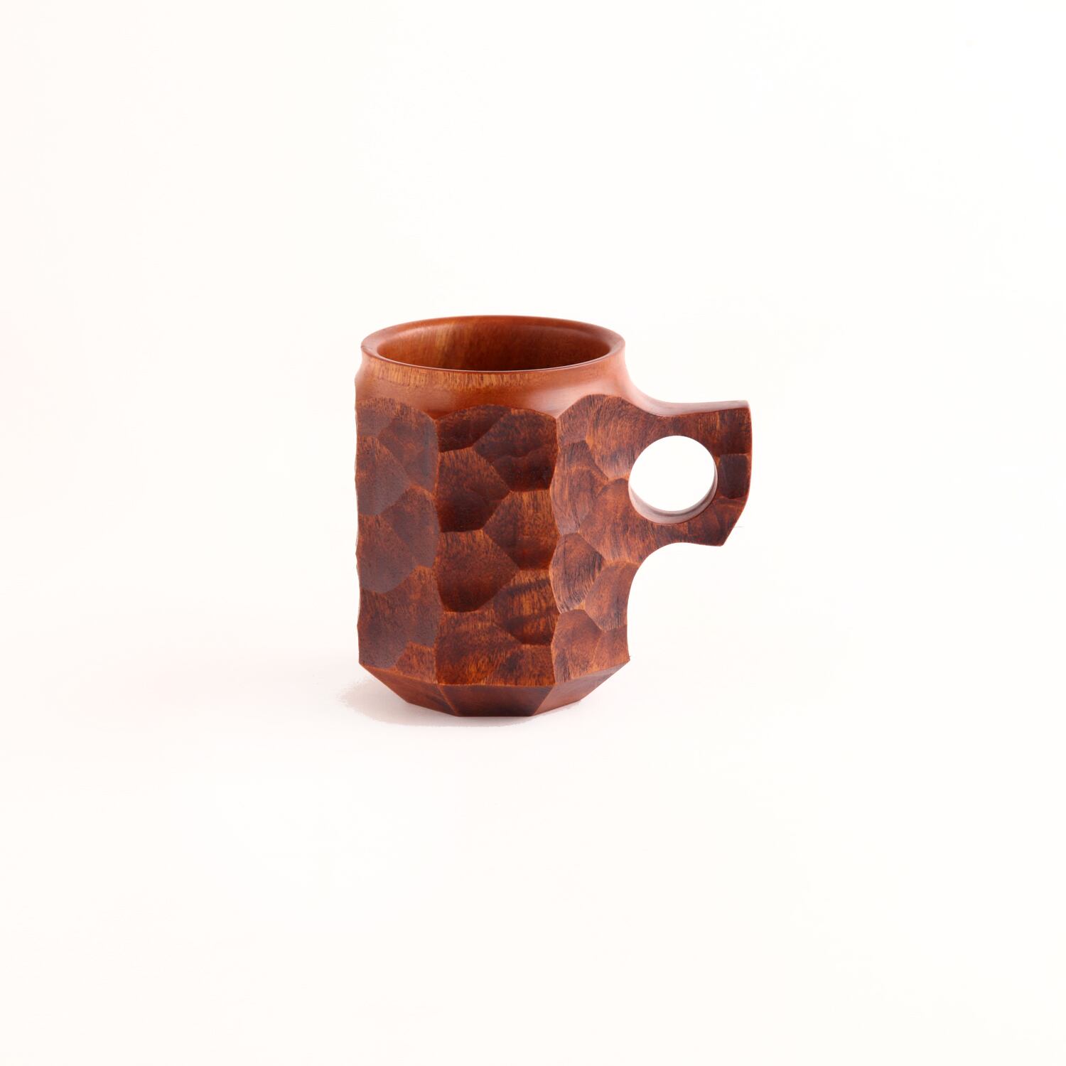 全て作家本人の手作りで、飲み口の薄さと滑らかさ、取っ手の持ちやすさ、表面の特徴的な削り出し、機能性と造形美の両方を兼ね備えた素敵なWood Cupです。容量はすりきり180cc。